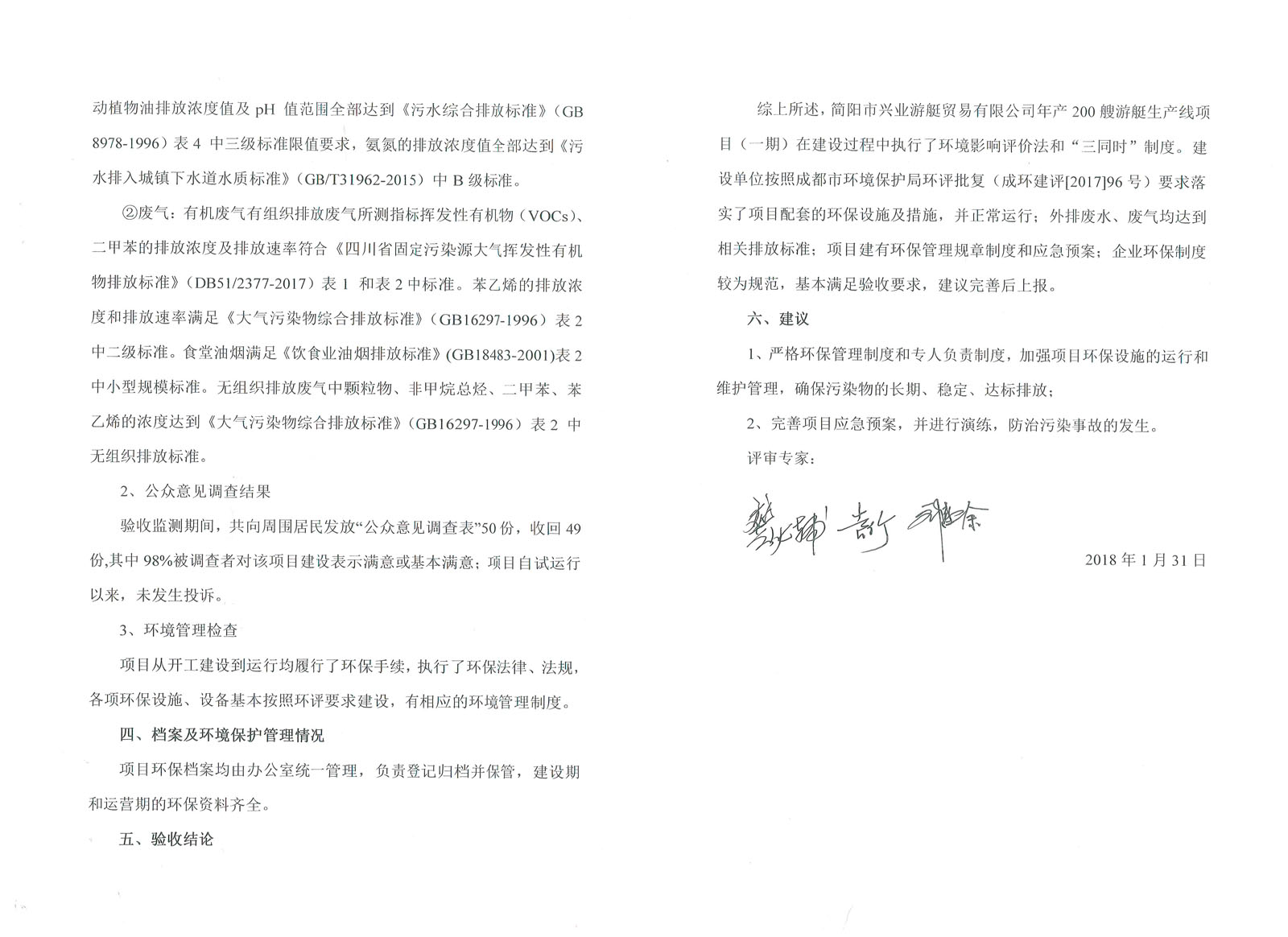 3、廢氣:玻璃鋼糊制區(qū)進(jìn)行密封,設(shè)有機(jī)廢氣處理間,玻璃鋼制作區(qū)產(chǎn)生的揮發(fā)性有機(jī)廢氣經(jīng)集氣罩收集后引入光氧氣催化裝置處理后由15米高排氣筒排放。苯乙烯排放滿足《惡臭污染物排放標(biāo)準(zhǔn)》(GB14554-93)二級標(biāo)準(zhǔn);vocs、二甲苯排放滿足《大氣污染物綜合排放標(biāo)準(zhǔn)》(GB16279-1996)表中的二級標(biāo)準(zhǔn)(vocs參考執(zhí)行非甲烷總烴排放標(biāo)準(zhǔn))。
